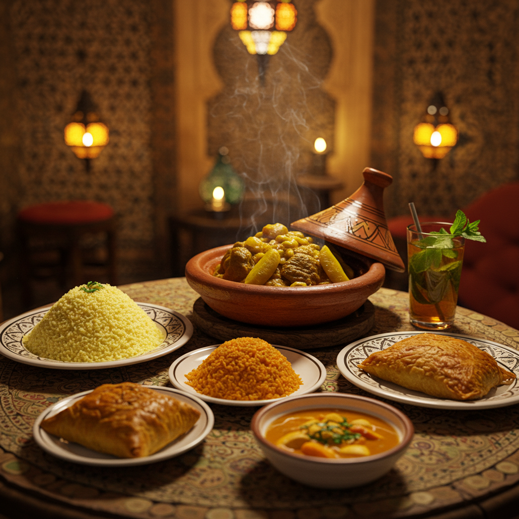 - 특징: 점토 냄비(타진)에서 천천히 익힌 고기와 채소 요리.