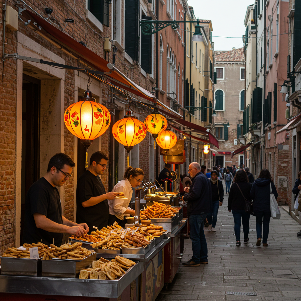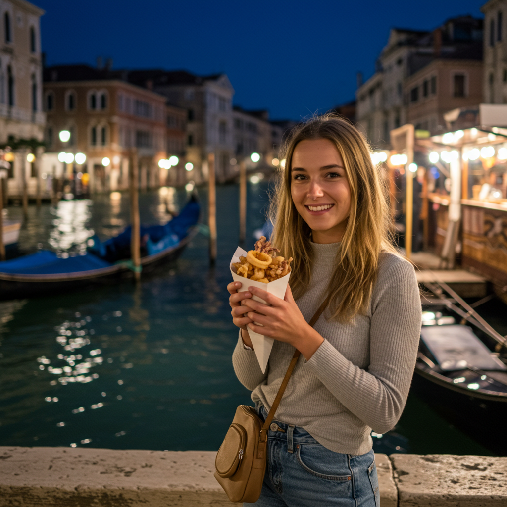 가격은 보통 5~8유로 정도이며, 리알토 다리 주변의 시장이나 소규모 푸드트럭, 포장마차에서 쉽게 찾아볼 수 있습니다. 종이 콘에 담긴 오징어 튀김을 손에 들고 운하를 바라보며 먹는 경험은 베네치아만의 특별한 추억이 될 것입니다.