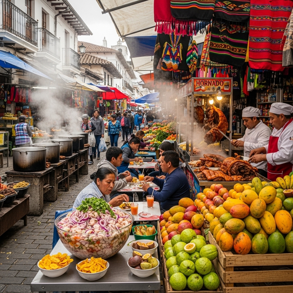 ‘Mercado Central de Quito’는 에콰도르의 대표 시장으로, 세비체, 혼고, 주스, 빵 등 현지 음식을 한자리에서 즐길 수 있다. ‘La Bahia Market’(과야킬)은 길거리 음식의 천국으로, 튀긴 바나나, 옥수수전, 생선구이를 맛볼 수 있다.
