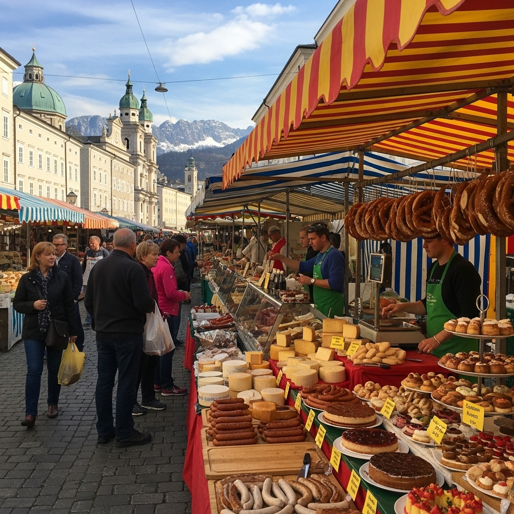 ‘Grünmarkt(그륀마르크트)’는 잘츠부르크의 대표 재래시장으로, 매일 오전 신선한 치즈, 햄, 브레첼, 과일, 꽃을 판매한다. 주말에는 ‘Residenzplatz’ 광장 주변 노점에서 소시지와 따뜻한 글뤼바인(뱅쇼)을 즐길 수 있다.
