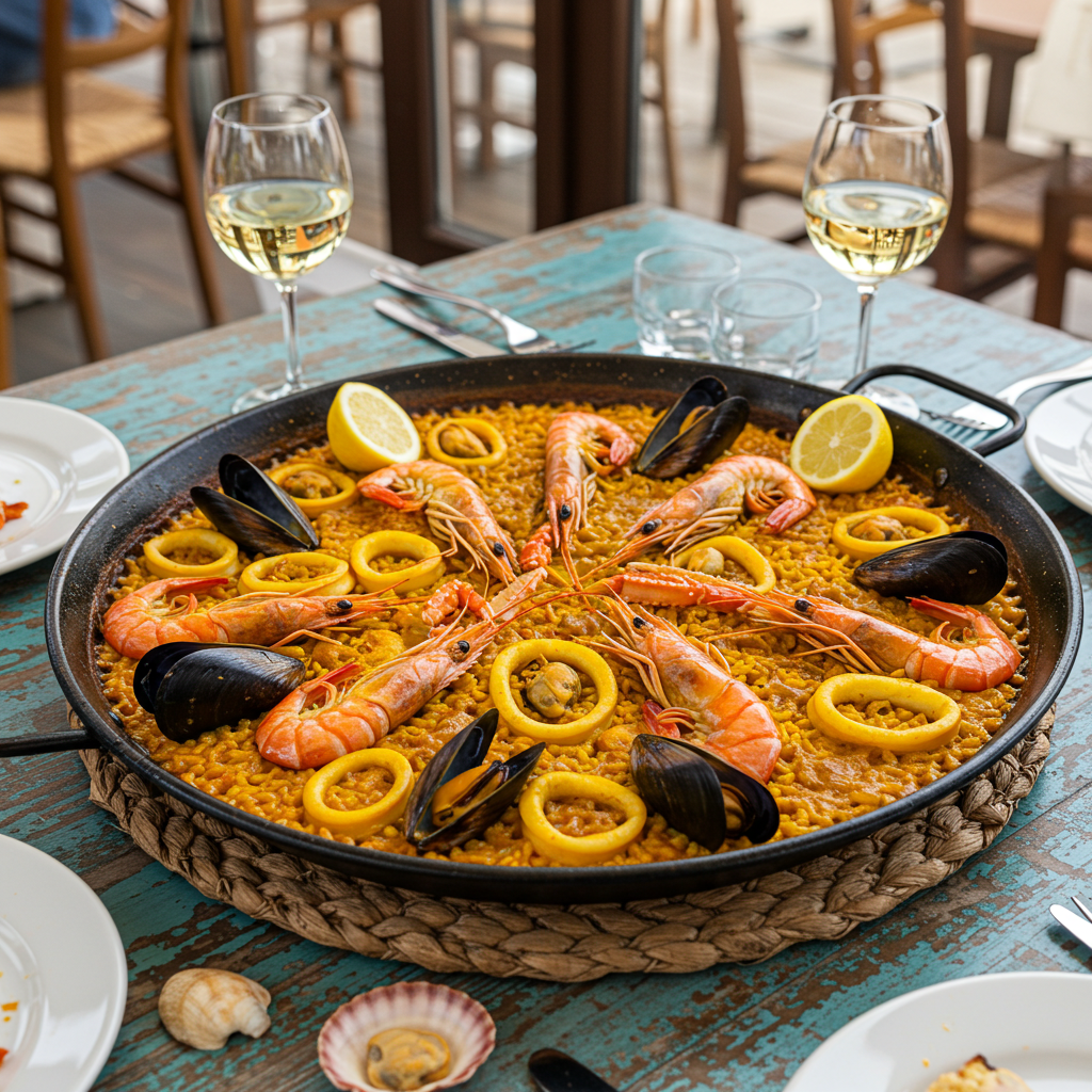- 특징: 사프란으로 색을 낸 노란 쌀밥에 새우, 홍합, 오징어 같은 해산물이 풍성하게 들어갑니다. 밥의 바닥이 바삭하게 눌린 ‘소까랏(Socarrat)’은 파에야의 하이라이트입니다.